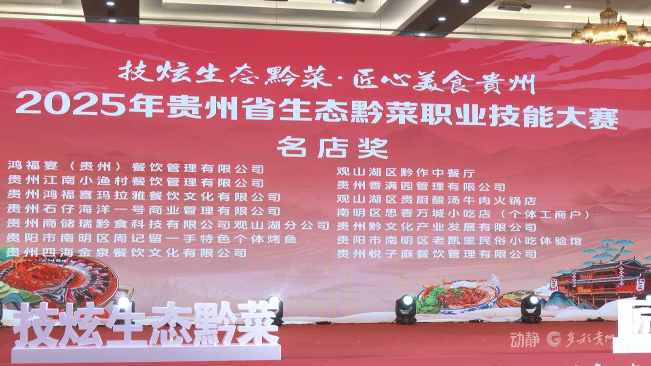在刚刚落幕的2025年贵州省生态黔菜职业技能大赛上,贵阳辣子鸡、青岩状元蹄、黔北糟辣鱼、关岭酸汤黄牛肉、凯里酸汤鱼、水城羊汤锅、兴义盗汗鸡、松桃卤鸭、毕节宫保鸡、独山虾酸牛肉入选2025年贵州省十大名菜榜单;江南小渔村、黔作中餐厅、周记留一手烤鱼等107家餐饮服务品质“名店”也同步揭晓!