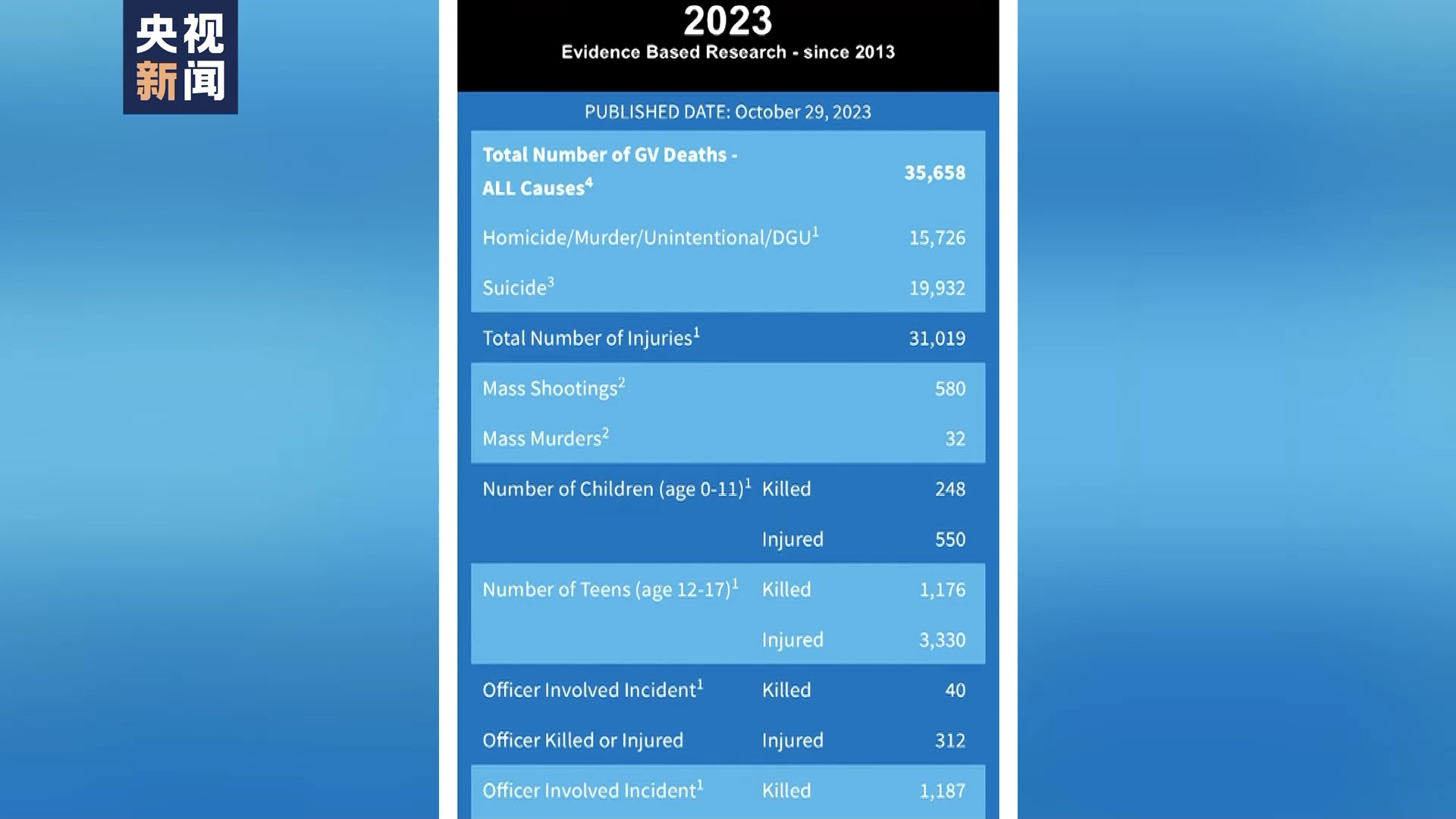 据美国枪支暴力档案网29日的数据显示,自今年年初以来,美国发生了至少580起大规模枪击事件,超过3.5万人在各类涉枪事件中丧生,超过3.1万人受伤。