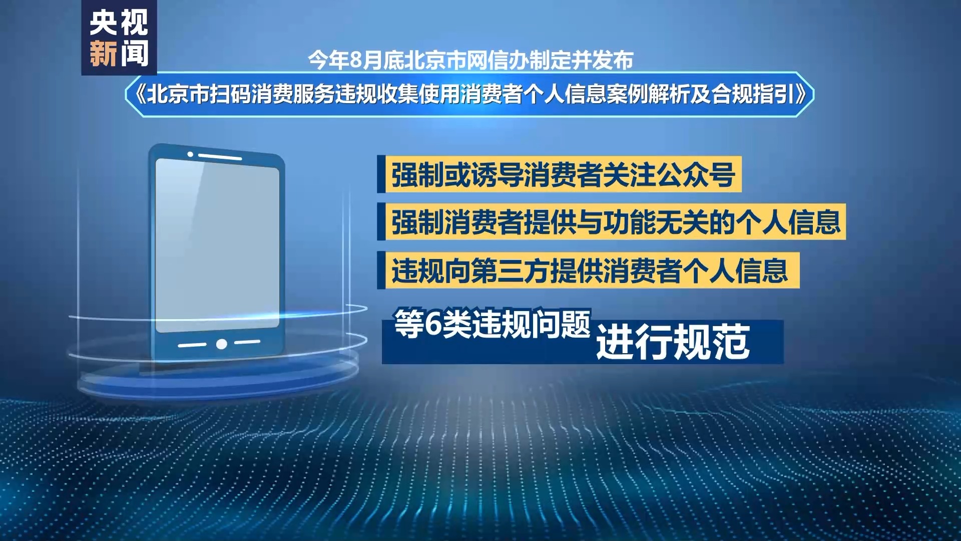 据了解,今年8月底北京市网信办制定并发布了《北京市扫码消费服务违规收集使用消费者个人信息案例解析及合规指引》,其中对于强制或诱导消费者关注公众号、强制消费者提供与功能无关的个人信息、违规向第三方提供消费者个人信息等6类违规问题进行了规范。
