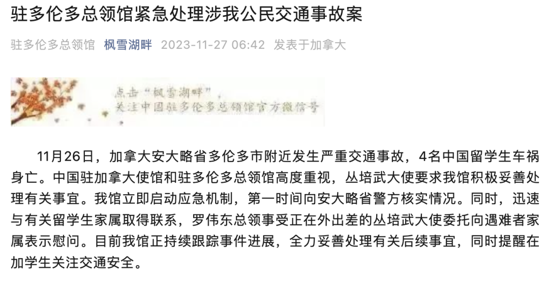 目前,驻多伦多总领馆正持续跟踪事件进展,全力妥善处理有关后续事宜,同时提醒在加学生关注交通安全。