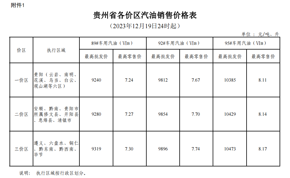 根据国家成品油价格形成机制,国家发展改革委决定自2023年12月19日24时起下调国内成品油价格。按照国家调整要求和相关规定,我省89#汽油(国VIB)、0#柴油价格每吨在现行标准基础上分别降低415元、400元,具体价格可由各经营企业在不超过最高批发、零售价格的前提下确定。调整后各油品最高价格见附件。