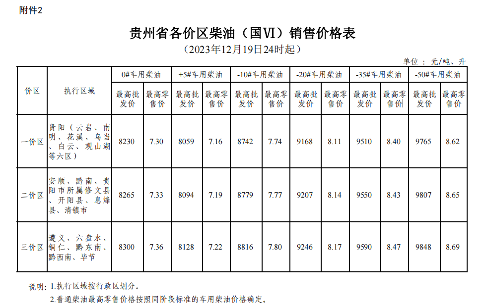 根据国家成品油价格形成机制,国家发展改革委决定自2023年12月19日24时起下调国内成品油价格。按照国家调整要求和相关规定,我省89#汽油(国VIB)、0#柴油价格每吨在现行标准基础上分别降低415元、400元,具体价格可由各经营企业在不超过最高批发、零售价格的前提下确定。调整后各油品最高价格见附件。