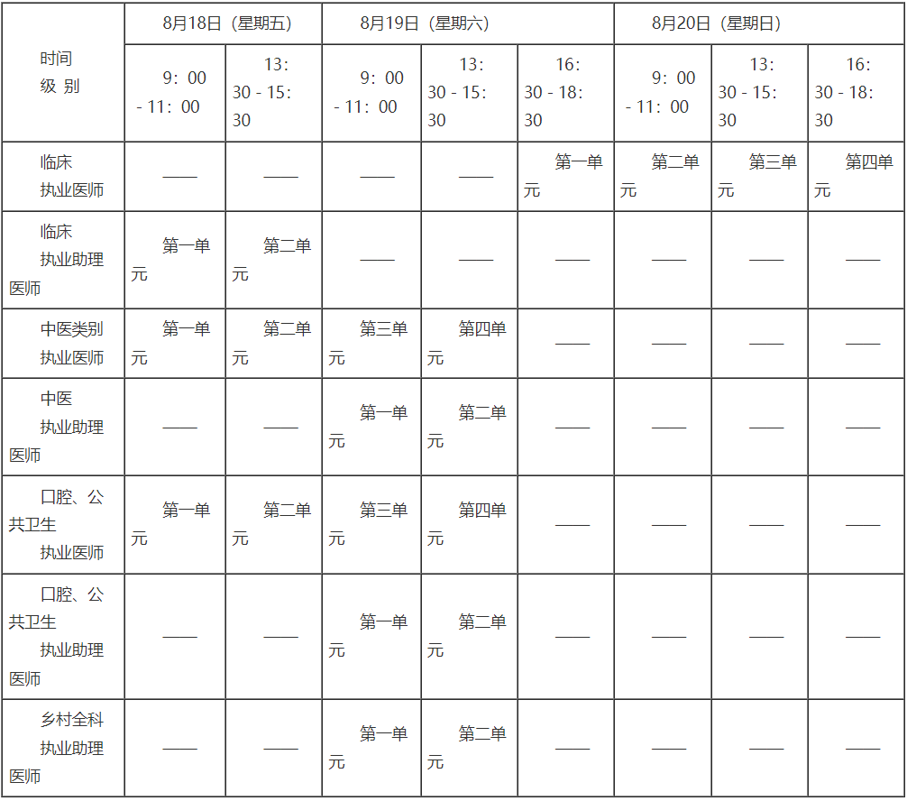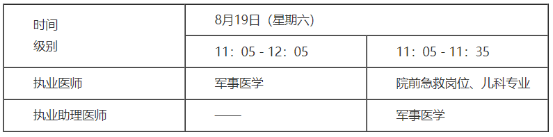 考试实行计算机化考试,军队现役人员加试军事医学,院前急救岗位和儿科专业加试相应内容。执业医师合格分数线为360分,执业助理医师合格分数线为180分。统一考试时间如下: