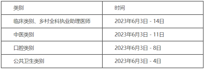 实践技能考试由省卫生健康委医师资格考试领导小组组织实施,除乡村全科执业助理医师类别外我省其余类别实践技能考试在国家实践技能考试基地进行。在国家实践技能考试基地参加考试且成绩合格的,成绩两年有效。实践技能考试合格分数线为60分。全国考试时间如下: