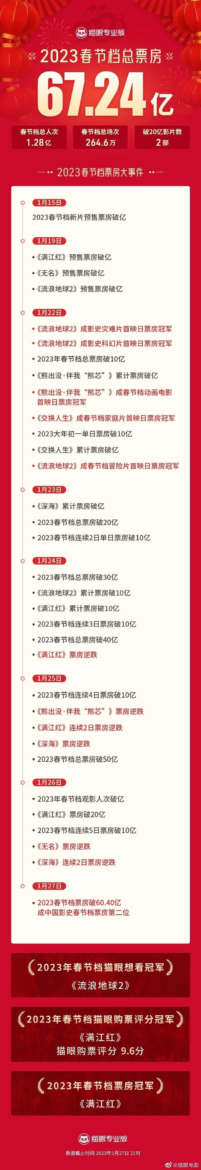猫眼专业版数据见证,截至1月27日21时,2023年春节档期总票房67.24亿,位列中国影史春节档票房榜第二位。总人次1.28亿,总场次264.6万,平均票价52.4元。共2部电影票房破20亿。