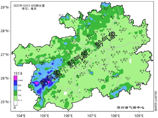 全省最大累计降水量为157.8毫米(盘州刘官),除省北部、西部、南部边缘等地有10毫米以上降水外,其余地区不足10毫米或无降水。
