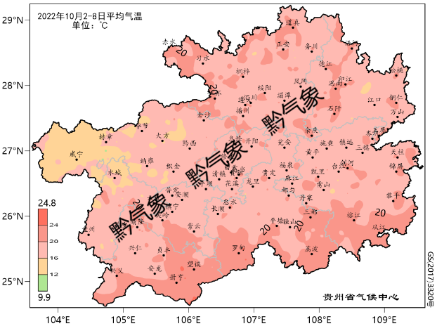 各地平均气温在9.9℃(赫章韭菜坪高山站)~24.8℃(望谟乐元)之间。