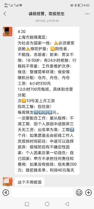 4月22日,上海市民包先生向上海奉贤公安分局江海派出所报案称,自己相信一个微信群中发布的招工信息,结果被骗了300元。包先生称当日其在一个微信群中看到一昵称为“诚信经营”的微信号在群内发布信息,称有渠道可以介绍人去方舱医院上班,包吃住不算,每天还能赚700元。包先生自己本是一名运输车的跟车工,因受疫情影响,本来就暂时停工,看到信息后心动不已,就与对方聊了起来。对方称需要收取接送费用。包先生毫不犹豫就向对方赚取了300元接送费。结果不仅打工无望,之后还联系不上对方,包先生才发现自己被骗。