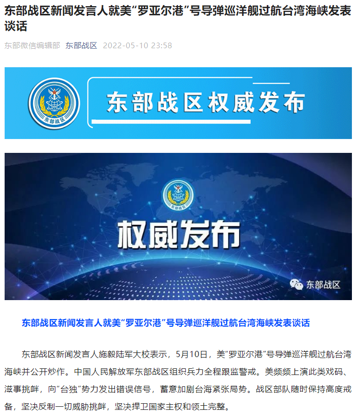 东部战区新闻发言人施毅陆军大校表示,5月10日,美“罗亚尔港”号导弹巡洋舰过航台湾海峡并公开炒作。中国人民解放军东部战区组织兵力全程跟监警戒。美频频上演此类戏码、滋事挑衅,向“台独”势力发出错误信号,蓄意加剧台海紧张局势。战区部队随时保持高度戒备,坚决反制一切威胁挑衅,坚决捍卫国家主权和领土完整。