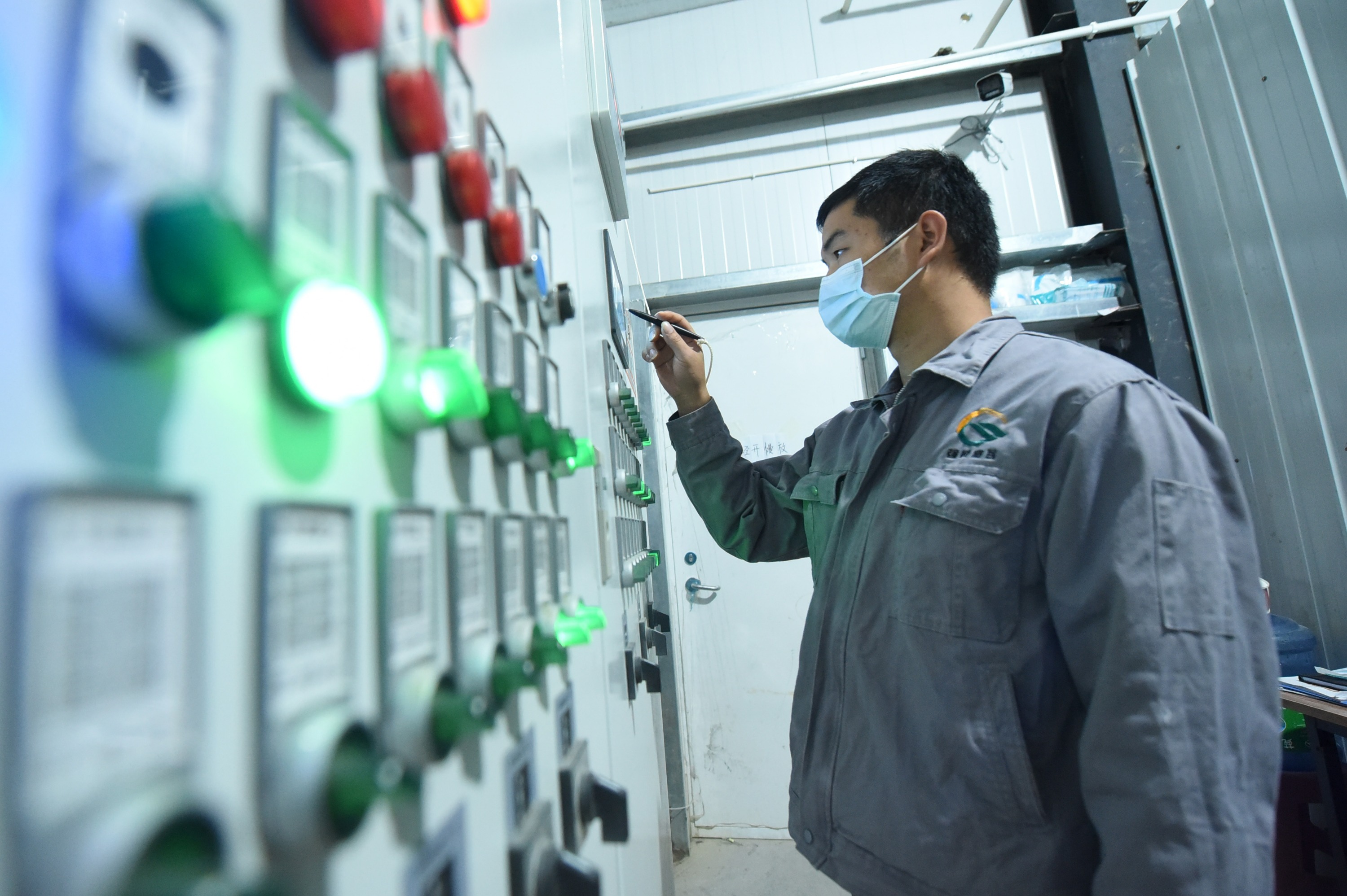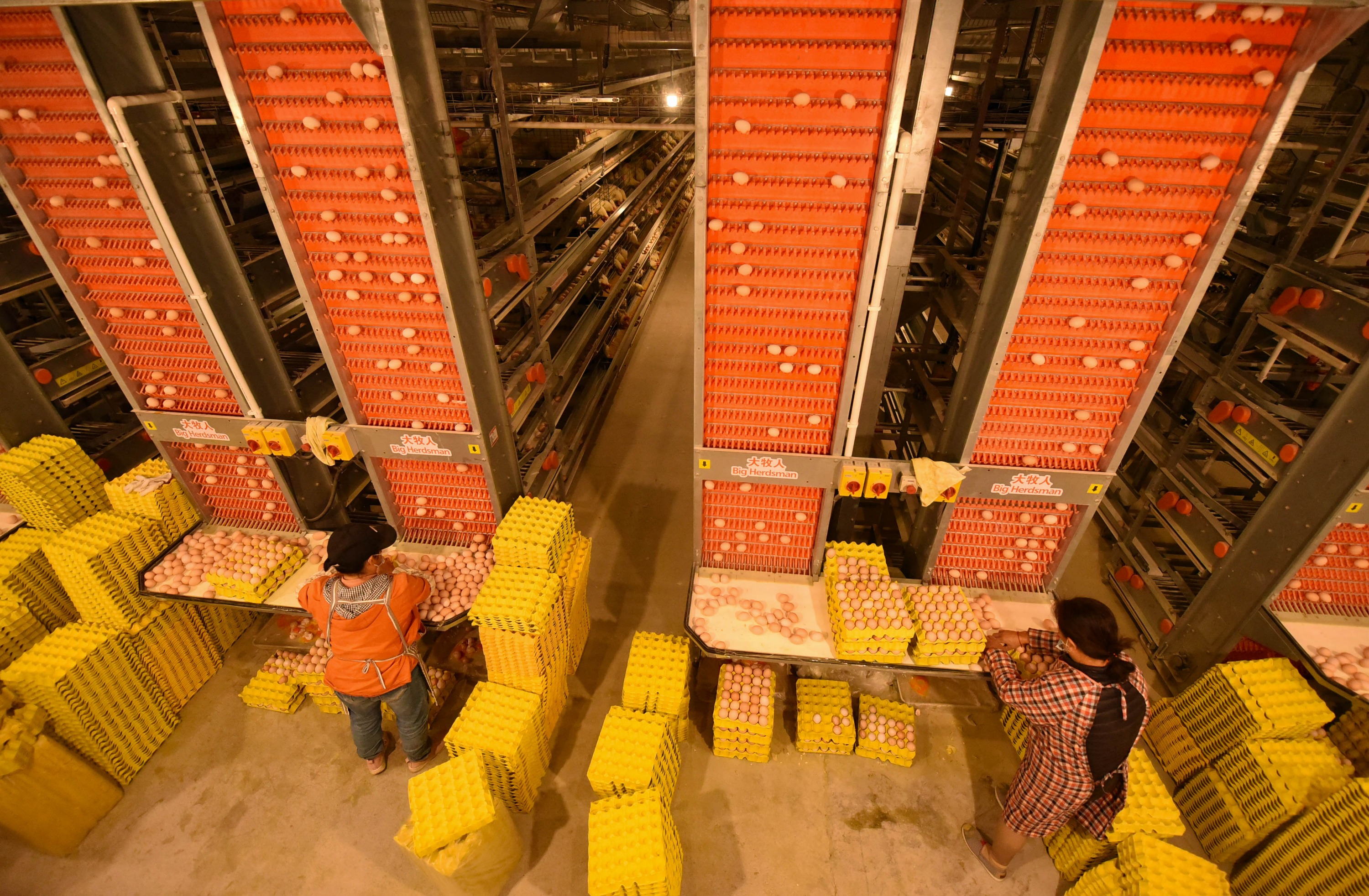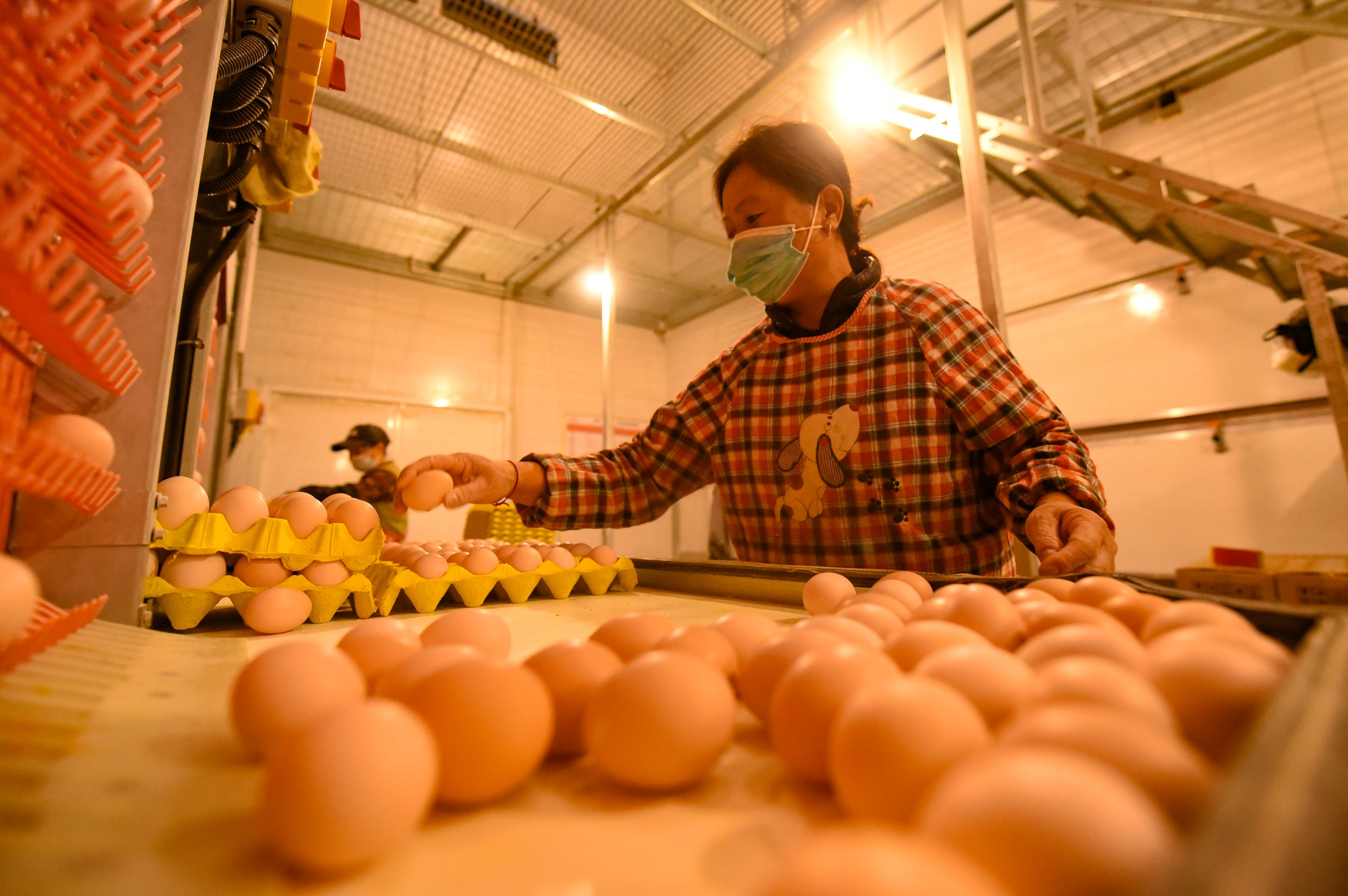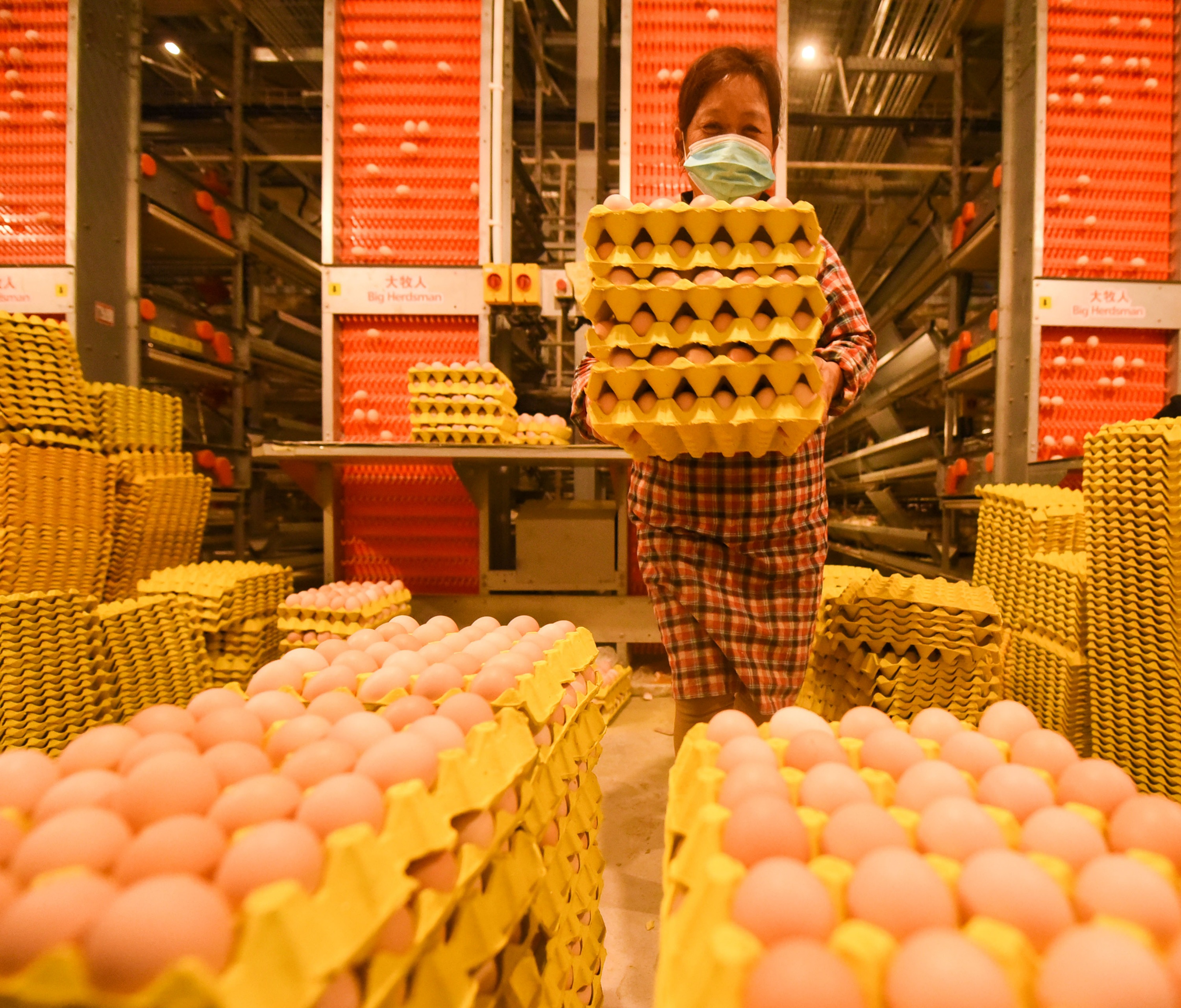 鸡舍与包装车间相连,在包装车间,工人忙着分拣鸡蛋、装箱。当作业面上的鸡蛋较多时,工人按下“集蛋列急停”按钮,传送带暂停,待重新开启后,又会重新运转起来。