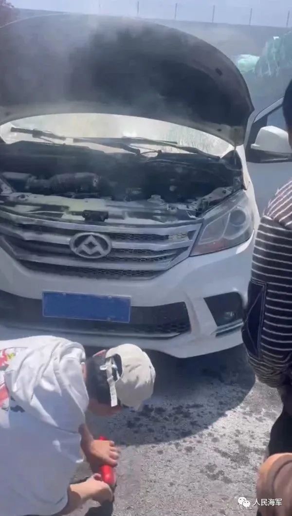 此时,他发现车辆的前挡风玻璃底端已有明火冒出,他赶紧举起手中的干粉灭火器,把明火扑灭。随后,他打开了冒烟的前引擎盖,一股热浪随即扑到了他的脸上。他压低了帽檐,判断分析着火冒烟的位置在发动机电瓶处。