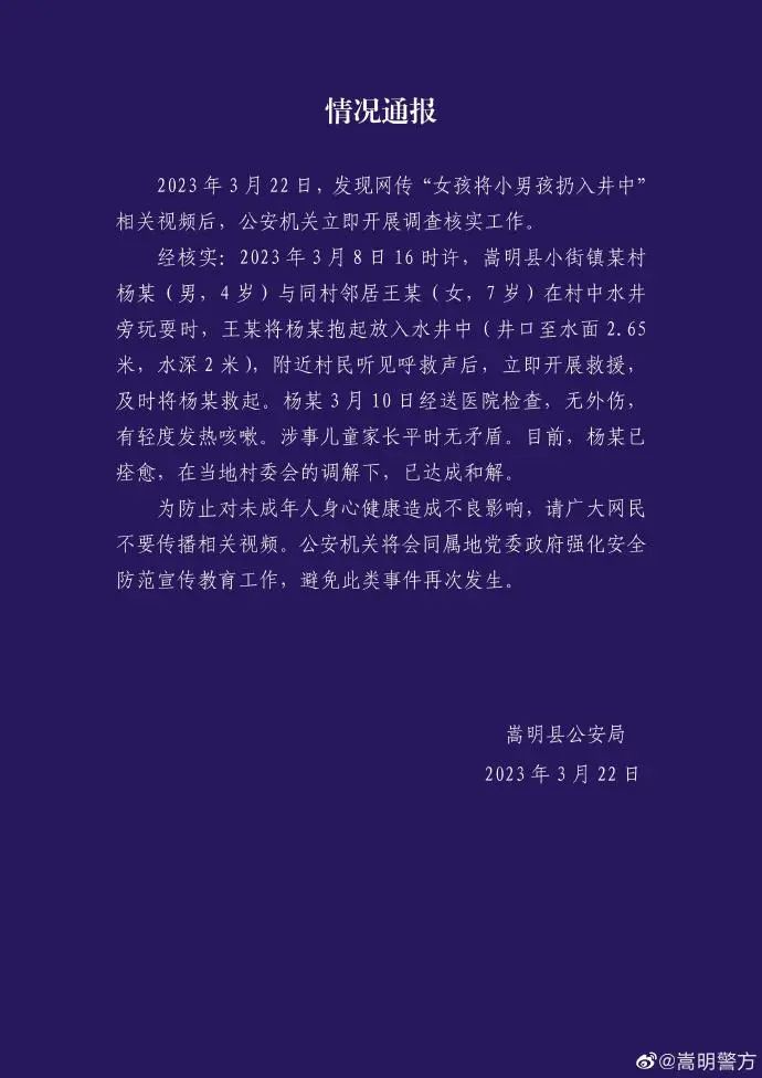 相关权威人士表示,两个孩子不是一家人,两家并无矛盾,在一起玩耍时女孩将男孩扔进了井中,目前,昆明市多部门已经前往事发的嵩明县进一步核实相关情况。
