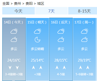 17日白天,省的西北部地区多云转阴天有阵雨或雷雨,局部伴有强对流天气,其余地区多云。