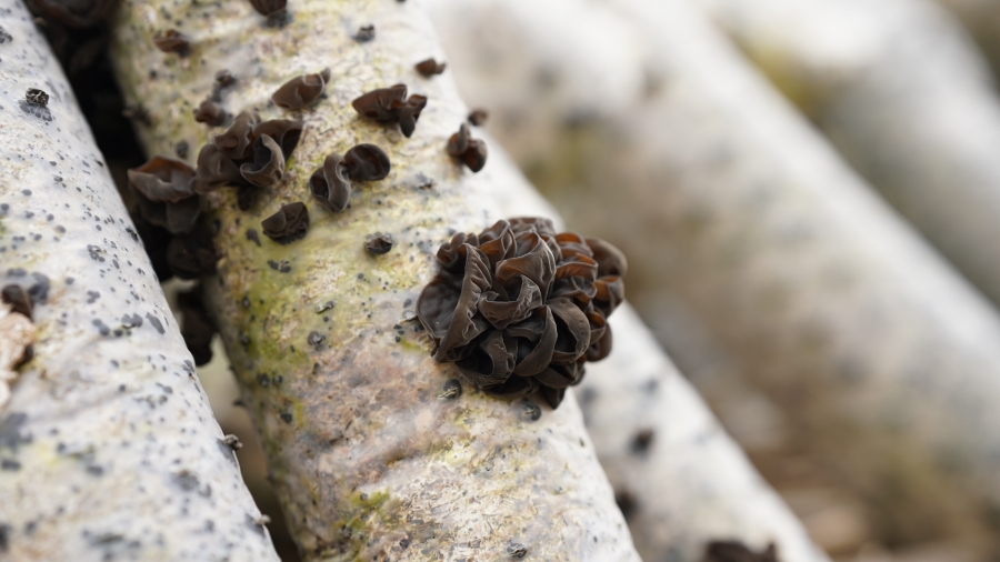 随着气温回升,休眠一个冬季的黑木耳快速抽芽生长,陆续迎来开采期。