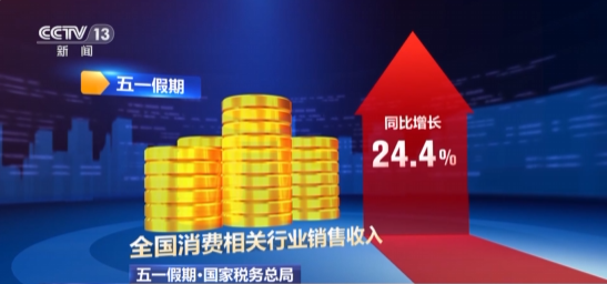国家税务总局增值税发票数据显示,“五一”假期,全国消费相关行业销售收入同比增长24.4%。其中,服务消费和商品消费同比分别增长28.7%和19.5%,反映居民消费意愿增强。