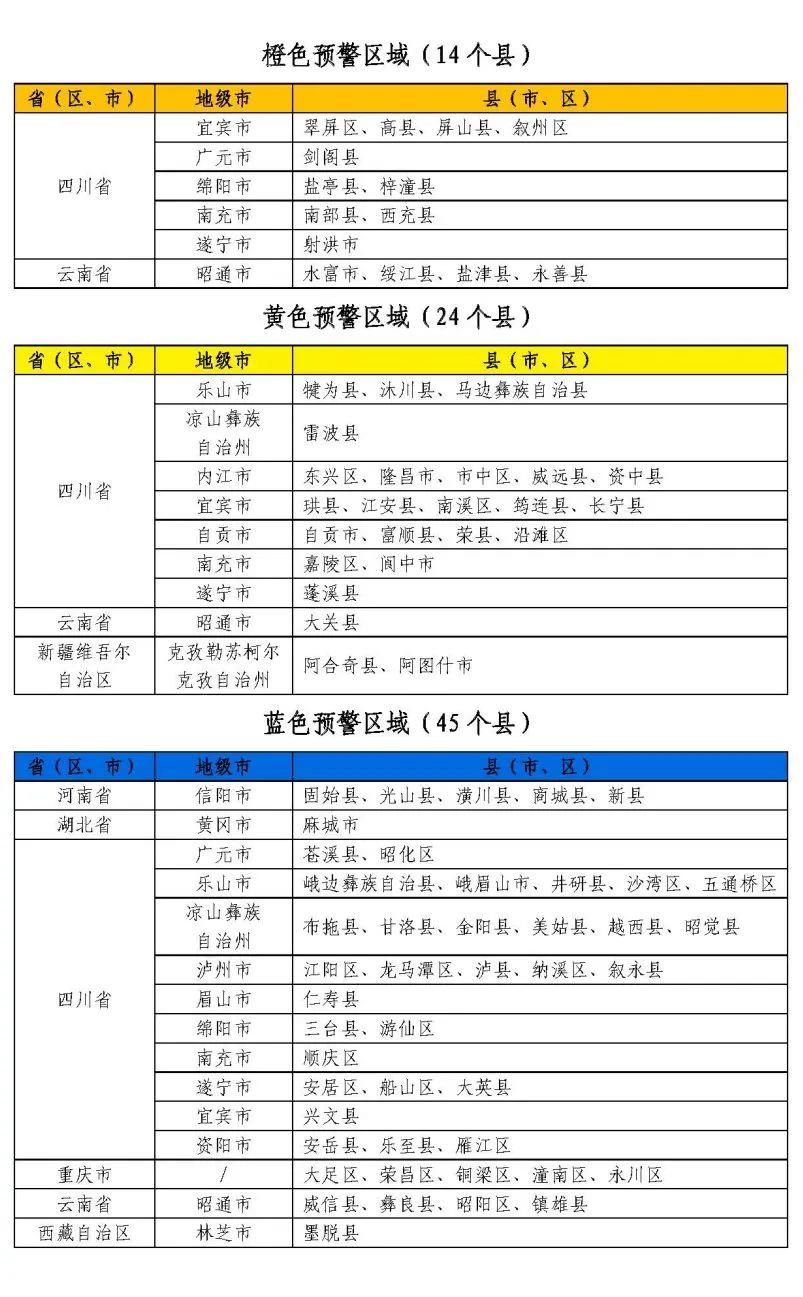 预计,7月13日20时至7月14日20时,四川东部、云南东北部、新疆西部等地部分地区发生山洪灾害可能性较大(黄色预警),其中,四川东部、云南东北部局地发生山洪灾害可能性大(橙色预警),预警区域涉及的县(市、区)见下表。其他地区也可能因局地短历时强降水引发山洪灾害,请各地注意做好实时监测、防汛预警和转移避险等防范工作。
