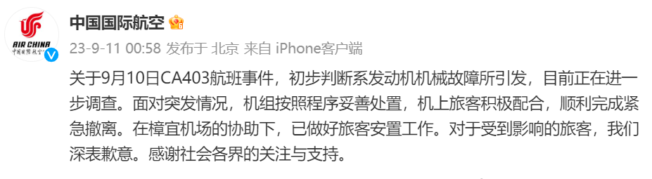 9月11日凌晨,@中国国际航空 发布消息称,关于9月10日CA403航班事件,初步判断系发动机机械故障所引发,目前正在进一步调查。
