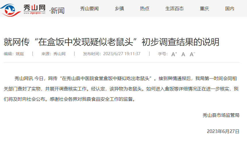 6月27日,秀山县市场监管局发布情况通报:今日,网传“在秀山县中医院食堂盒饭中疑似吃出老鼠头”。接到舆情通报后,我局第一时间会同相关部门查封了实物,并展开调查核实工作。经认定,该异物为老鼠头。如何进入盒饭等详细情况正在进一步核实,我们将及时向社会公布。感谢社会各界对我县食品安全工作的监督。