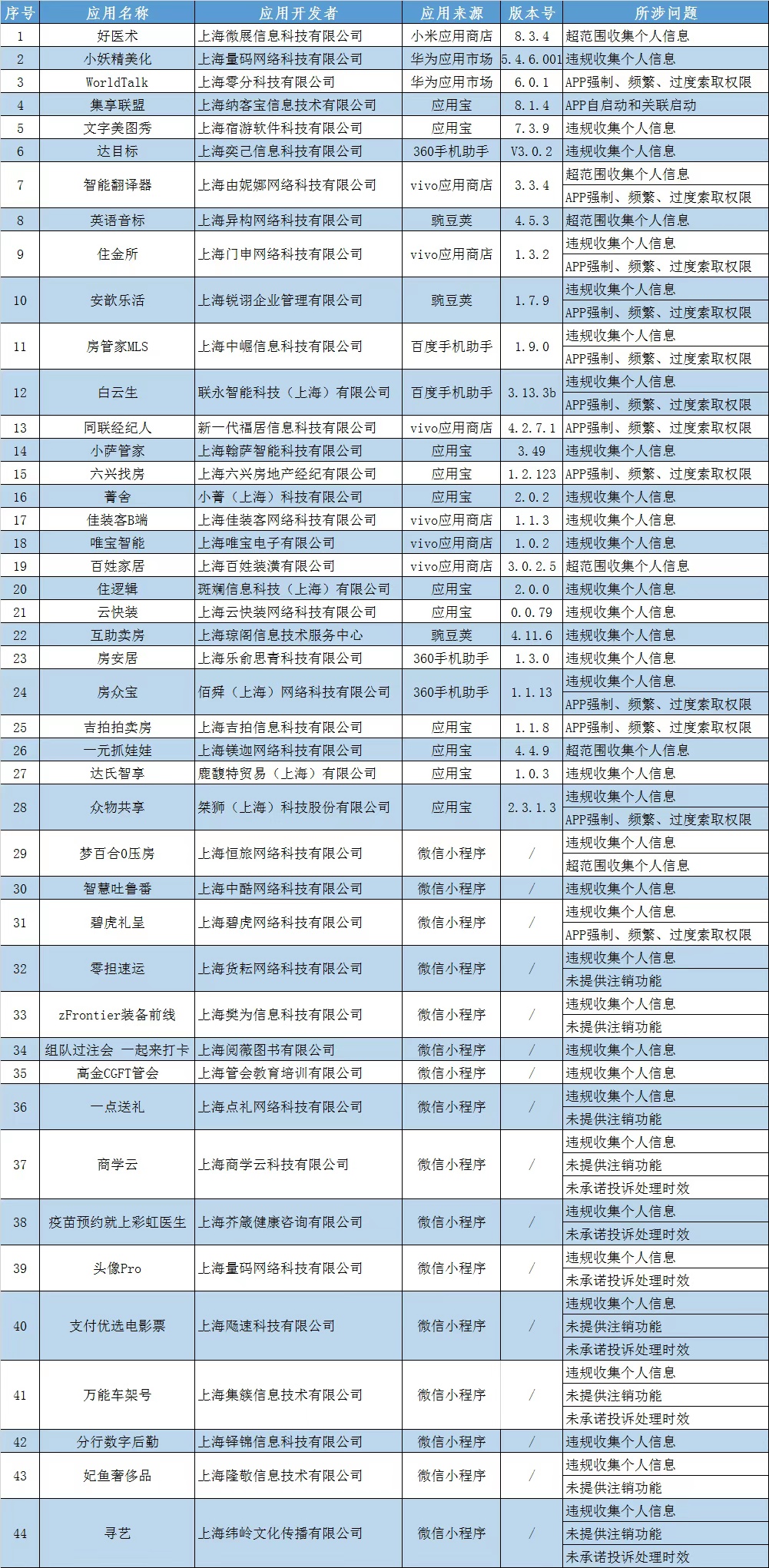 8月23日,上海市通信管理局发布关于侵害用户权益行为APP的通报(2023年第二批)。通报称,截至目前,尚有44款APP未完成整改,上述APP应在8月30日前落实整改工作。逾期不整改的,该局将依法依规组织开展处置工作。