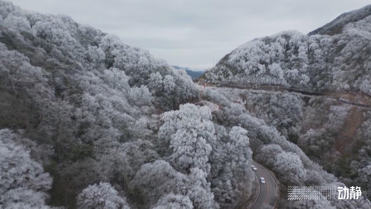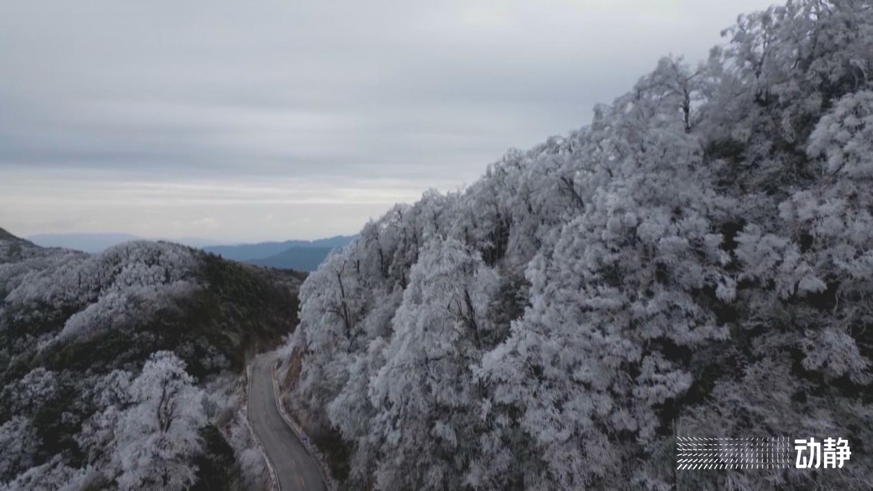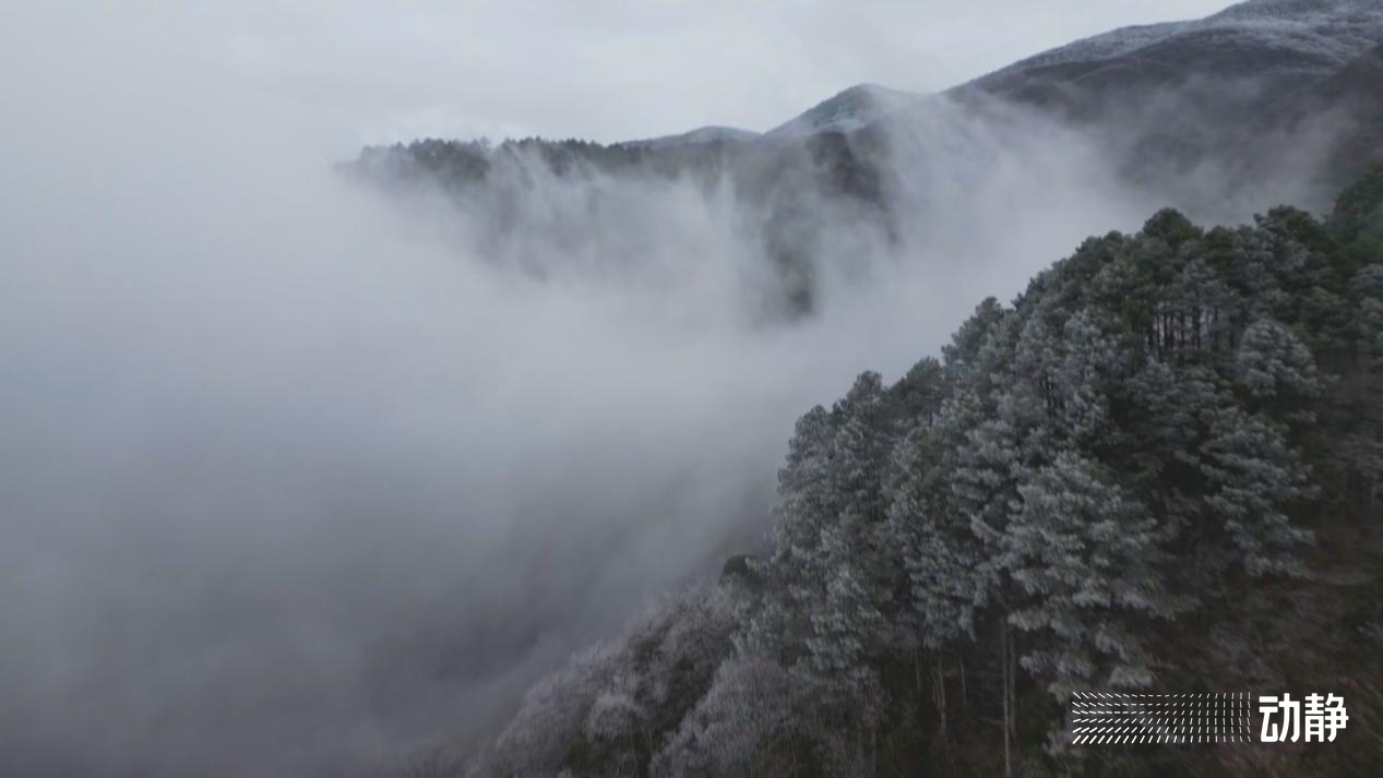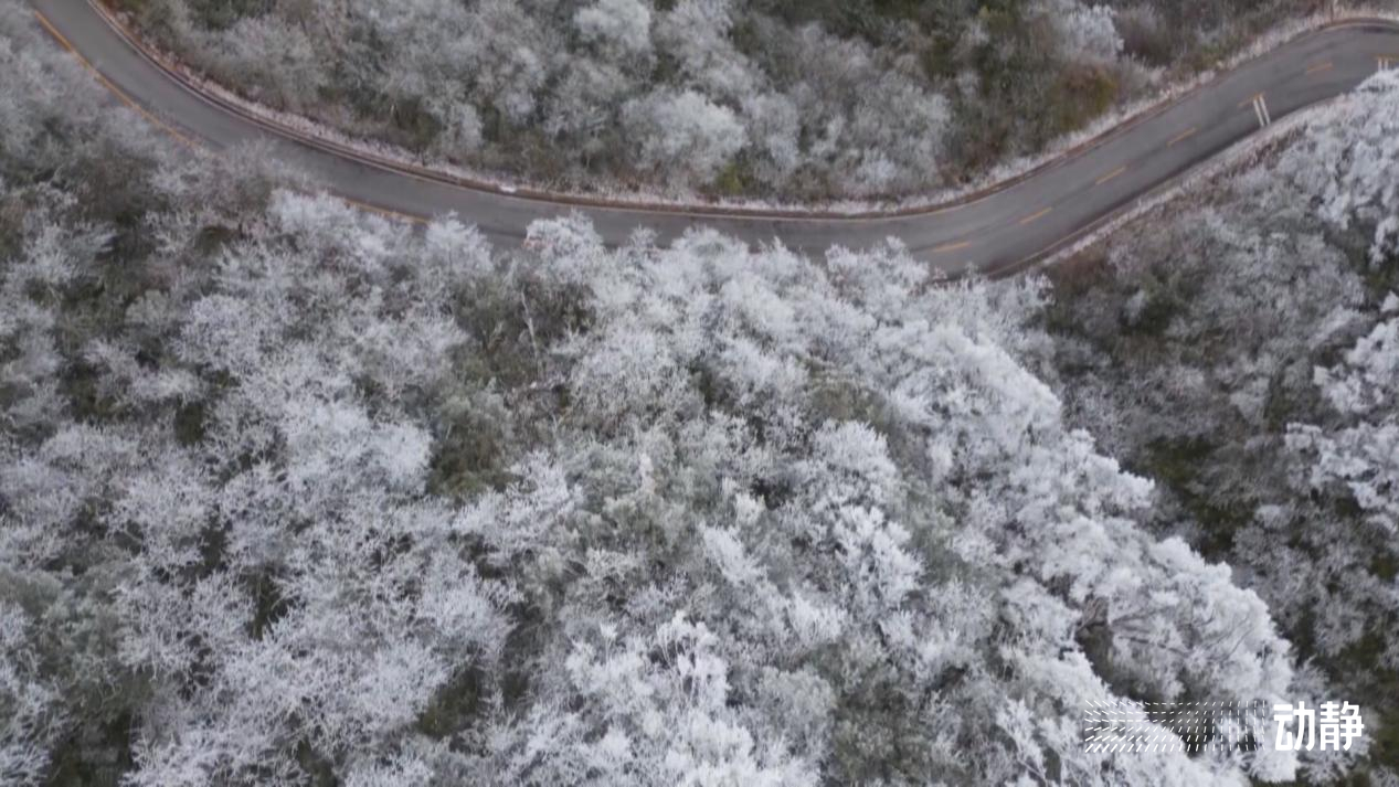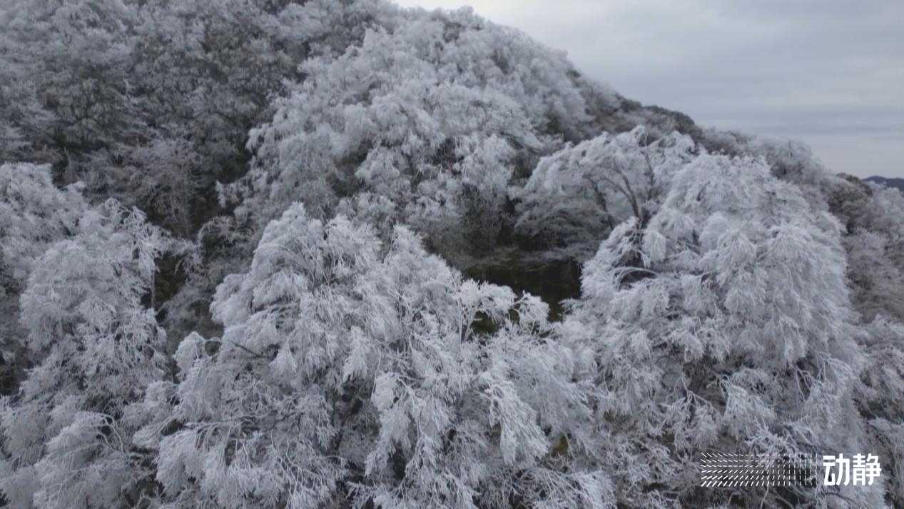 从空中俯瞰,雾气弥漫的连绵群山白茫茫一片,漫山遍野银装素裹,晶莹闪烁的雾凇缀满枝头,玉树琼枝,美不胜收,如同一幅纯洁宁静的水墨画卷,将冬日的氛围感拉满。