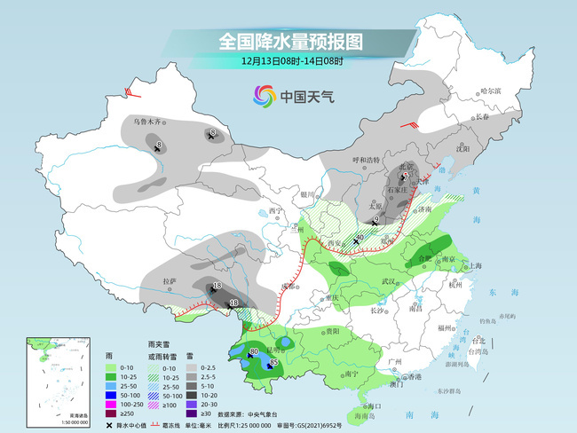 本周,我国天气舞台的主题仍是大范围雨雪和降温。昨天(12月10日)开始,中东部新一轮大范围雨雪天气过程来袭,华北、黄淮多地雨雪纷飞。13日至15日,还将有一轮大范围雨雪接踵而至,并且强降雪落区将高度重合,需注意防范。此外,我国北方地区未来几天气温持续偏低,冷上加冷;南方的降温大幕今天也将开启,江南、华南部分地区将出现6~12℃的降温。