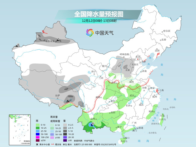 明天,预计新疆北部、西藏大部、青海南部、陕西北部、华北西部、河南中部等地部分地区有小到中雪或雨夹雪,其中,新疆沿天山地区和伊犁河谷、西藏东南部和北部等地部分地区有大到暴雪(10~18毫米)。云南中南部等地部分地区有中到大雨,局地暴雨(50~85毫米)。