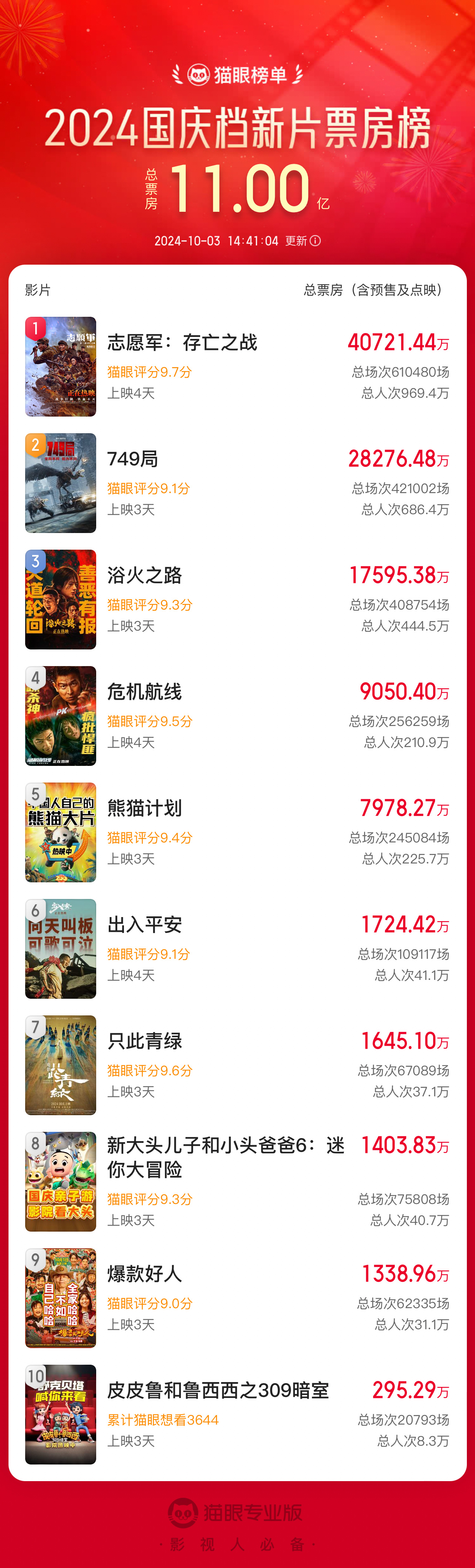 据猫眼专业版数据,截至10月3日14时41分,2024年国庆档新片总票房(含预售及点映)破11亿!《志愿军:存亡之战》《749局》《浴火之路》分列国庆档新片票房榜前三位。