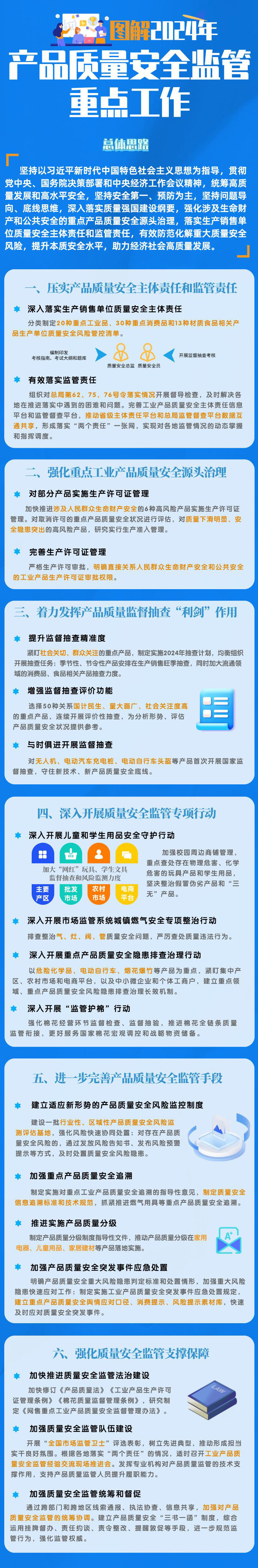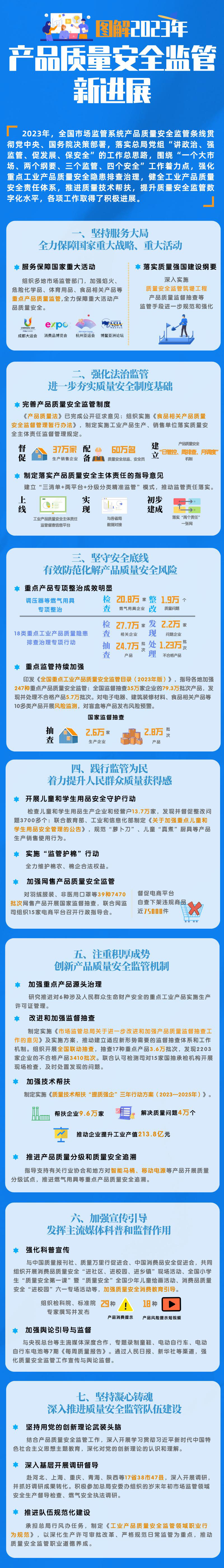 同时市场监管总局2024年将分类制定20种重点工业品、30种重点消费品和13种材质食品相关产品生产单位质量安全风险管控清单,对质量下滑明显、安全隐患突出的高风险产品,研究实行生产准入管理。选择50种关系国计民生、量大面广、社会关注度高的重点产品,连续开展评价性抽查,为分析形势、评估产品质量安全状况提供参考。