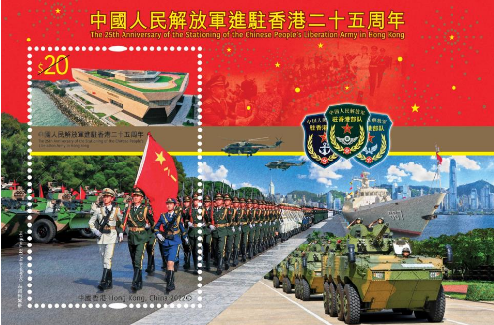 香港邮政表示,2022年为香港特别行政区成立25周年,随着香港国安法及完善选举制度的落实,“一国两制”得以行稳致远。中国人民解放军驻港部队自进驻香港以来,一直坚决贯彻“一国两制”方针和香港基本法、《中华人民共和国香港特别行政区驻军法》及香港国安法,维护国家主权、安全、发展利益,是维护香港繁荣稳定的重要基石。