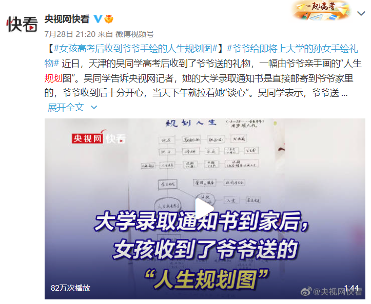 近日,天津的吴同学高考后收到了爷爷送的礼物,一幅亲手画的“人生规划图”。吴同学表示,录取通知书到的那天爷爷很开心,下午就拉着她“谈心”。“人生规划图”会带她找到努力的方向,提醒她大学也要坚持学习。