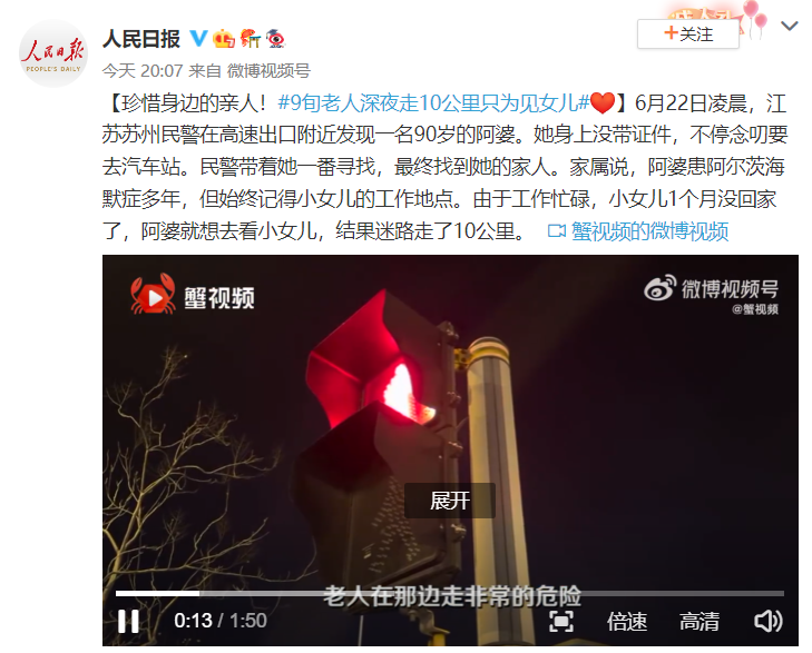 6月22日凌晨,江苏苏州民警在高速出口附近发现一名90岁的阿婆。她身上没带证件,不停念叨要去汽车站。民警带着她一番寻找,最终找到她的家人。家属说,阿婆患阿尔茨海默症多年,但始终记得小女儿的工作地点。由于工作忙碌,小女儿1个月没回家了,阿婆就想去看小女儿,结果迷路走了10公里。