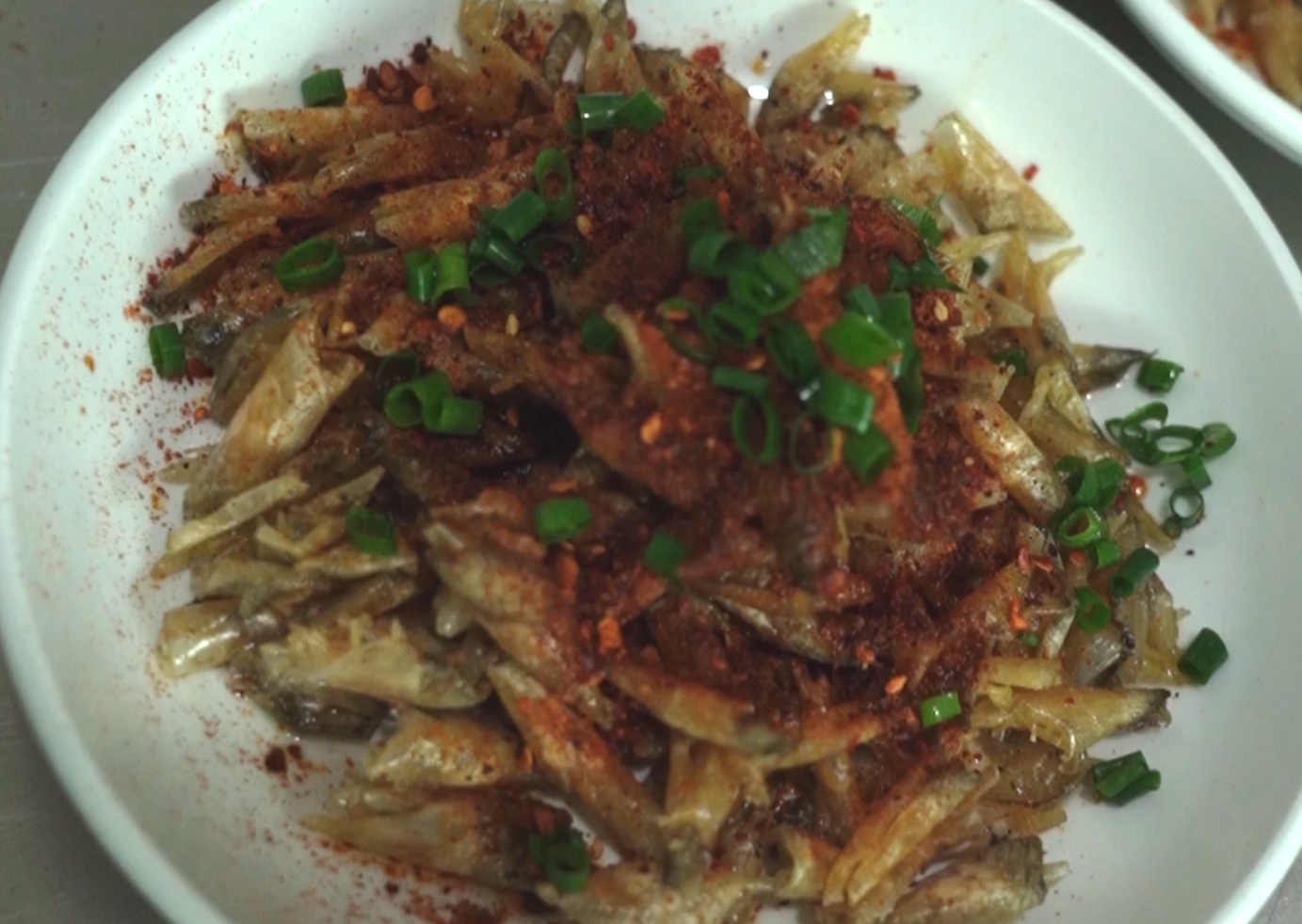 平常作为垃圾的“鱼鳞”,在这里用油炸过之后撒上辣椒粉和香葱,也成为一道美味,味道怎么样,看瓢瓢的表情就知道。