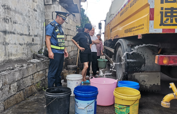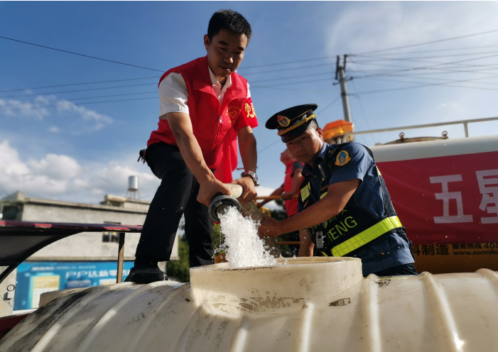 村民张先生自己修了个蓄水池,由于干旱时间较长,蓄水池已经不能正常供水,当二大队执法人员将水车移动到水池旁,把水管直接搭进蓄水池,不一会儿功夫,水池就蓄满了。“这段时间基本上没下雨,太老火了,幸好有你们帮我们,我们才能度过这次难关。”张先生深有感触地说。