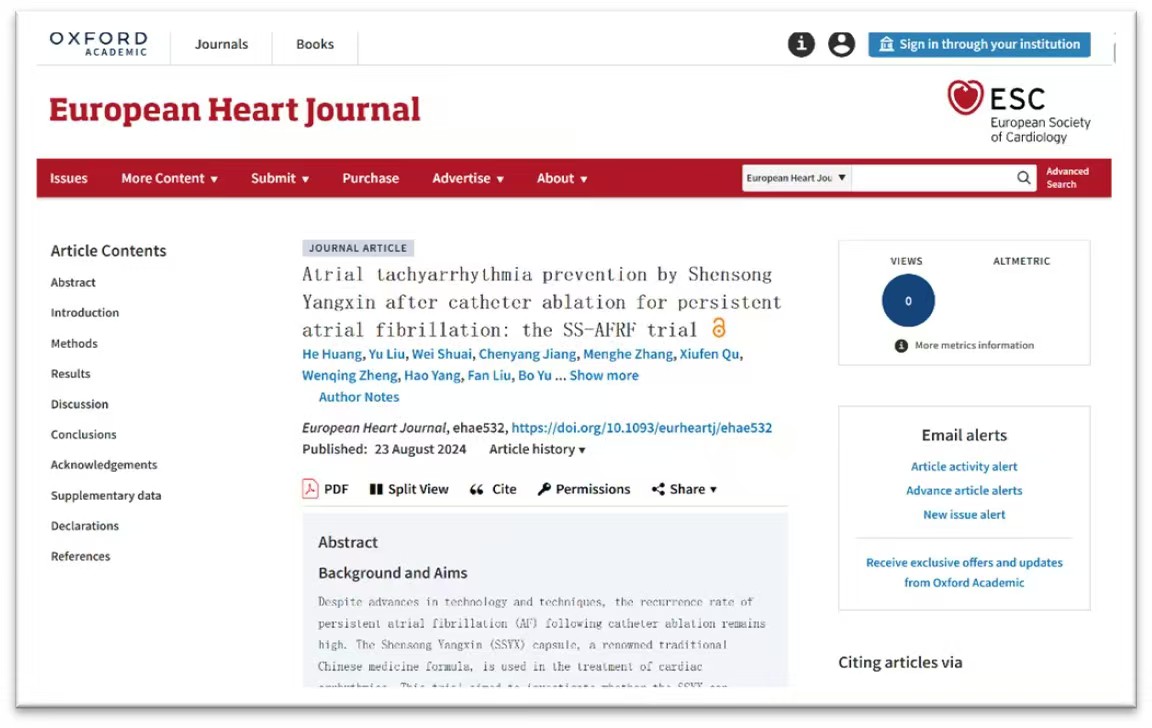 欧洲时间8月23日,国际心血管病领域顶级期刊《欧洲心脏杂志》(European Heart Journal)刊登了由中国武汉大学人民医院黄鹤教授团队牵头完成的“参松养心对经射频消融房颤患者预后临床研究”论文《持续性房颤导管消融后参松养心胶囊预防房性快速性心律失常:SS-AFRF试验》。该论文指出,参松养心可有效降低持续性房颤患者射频消融术后一年内复发风险40%。