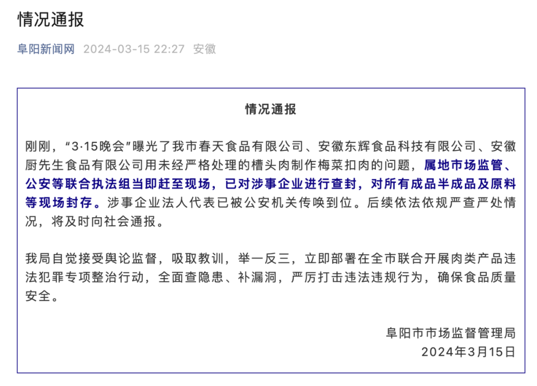 “3·15晚会”曝光了阜阳市春天食品有限公司、安徽东辉食品科技有限公司、安徽厨先生食品有限公司用未经严格处理的槽头肉制作梅菜扣肉的问题,属地市场监管、公安等联合执法组当即赶至现场,已对涉事企业进行查封,对所有成品半成品及原料等现场封存。涉事企业法人代表已被公安机关传唤到位。后续依法依规严查严处情况,将及时向社会通报。