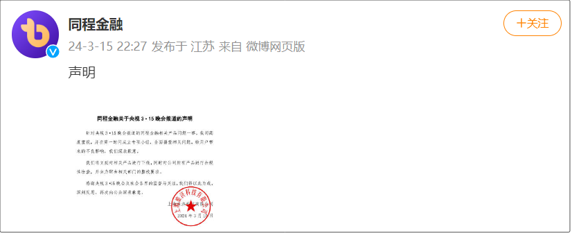 同程金融发布致歉声明