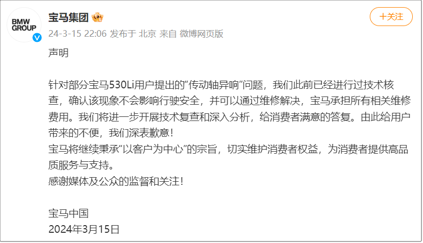 针对部分宝马530Li用户提出的“传动轴异响”问题,我们此前已经进行过技术核查,确认该现象不会影响行驶安全,并可以通过维修解决,宝马承担所有相关维修费用。我们将进一步开展技术复查和深入分析,给消费者满意的答复。由此给用户带来的不便,我们深表歉意!