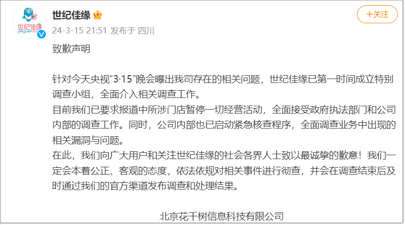 @世纪佳缘 发布致歉声明: