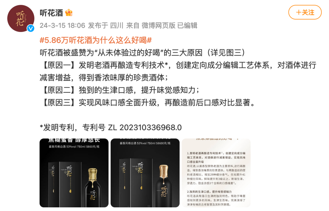 而就在晚会播出前,听花酒微博还发文鼓吹“5.86万听花酒为什么这么好喝”“5.86万听花酒为什么贵”,并标榜其发明专利。