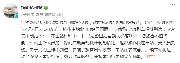 4月7日,@铁路杭州站 发布微博,就“南站出站口拥堵”致歉。