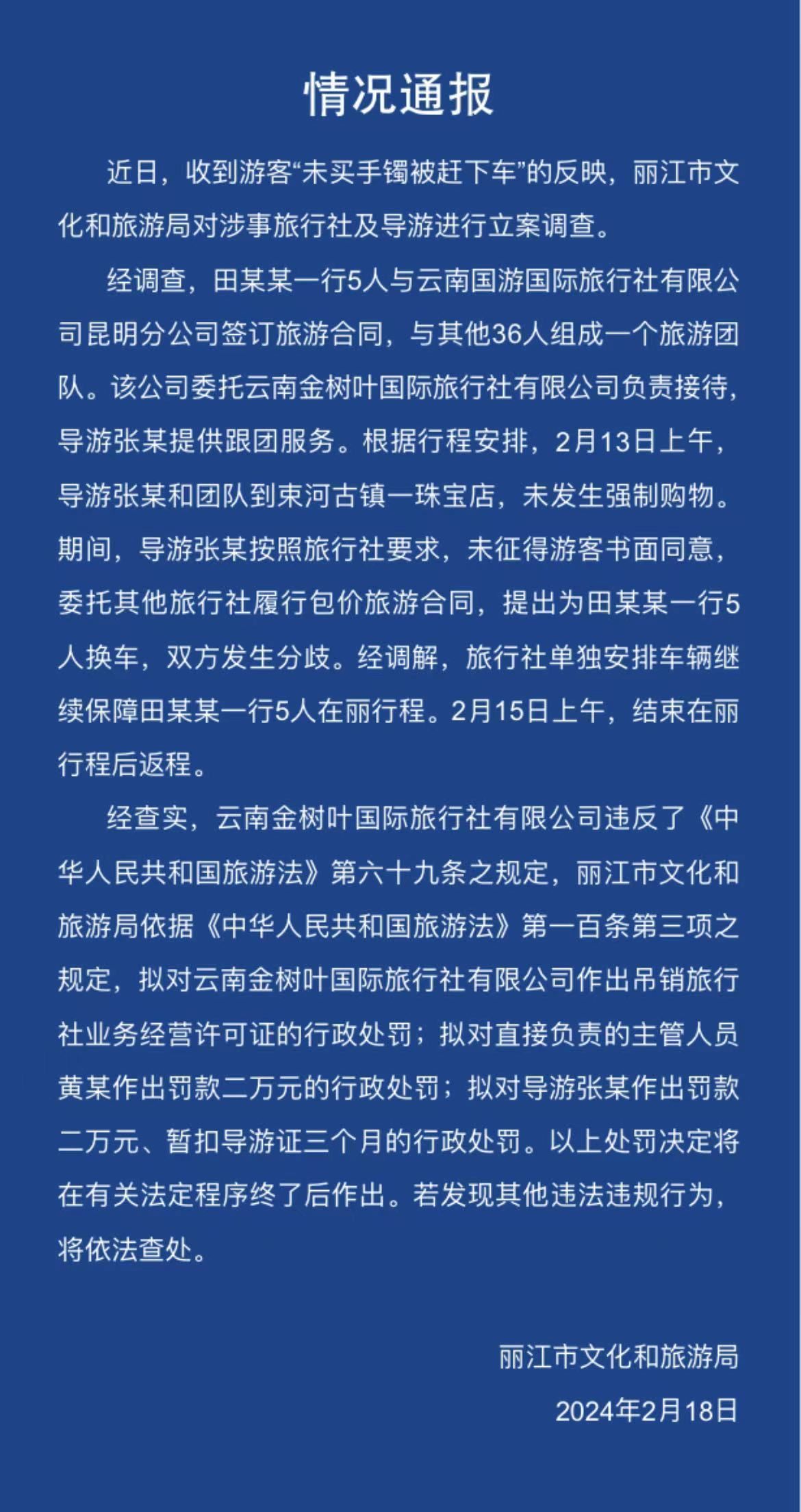 2月18日,丽江通报游客“未买手镯被赶下车”处置情况,拟对导游罚款两万、暂扣导游证三个月,处罚决定将在有关法定程序终了后作出。若发现其他违法违规行为,将依法查处。