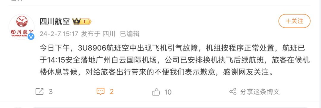 四川航空微博7日发文称,今日下午,3U8906航班空中出现飞机引气故障,机组按程序正常处置,航班已于14:15安全落地广州白云国际机场,公司已安排换机执飞后续航班,旅客在候机楼休息等候,对给旅客出行带来的不便我们表示歉意,感谢网友关注。