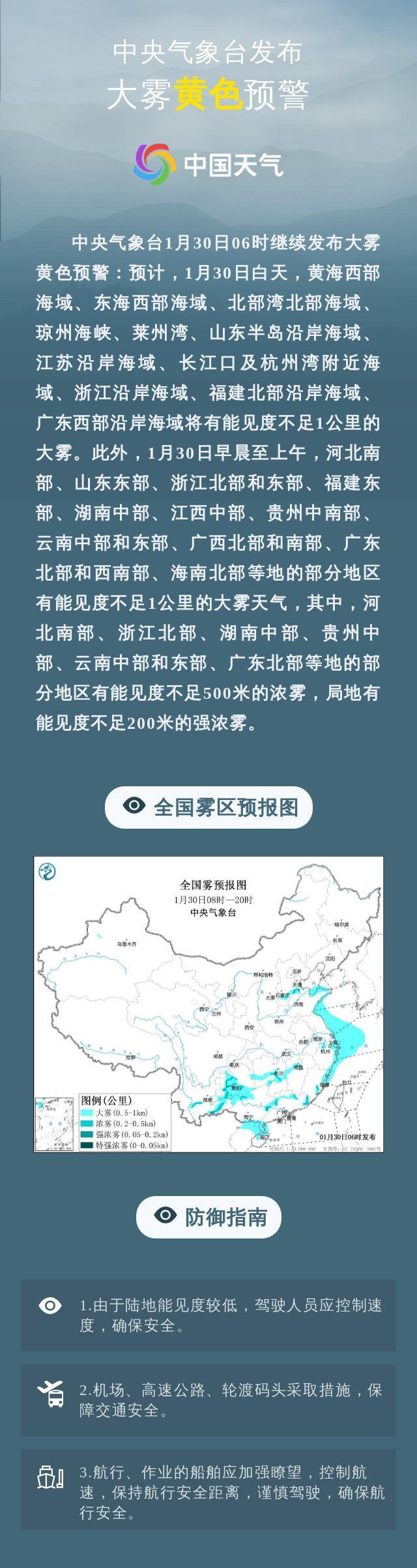 中央气象台1月30日06时继续发布大雾黄色预警:预计,1月30日白天,黄海西部海域、东海西部海域、北部湾北部海域、琼州海峡、莱州湾、山东半岛沿岸海域、江苏沿岸海域、长江口及杭州湾附近海域、浙江沿岸海域、福建北部沿岸海域、广东西部沿岸海域将有能见度不足1公里的大雾。看全国雾区预报图↓