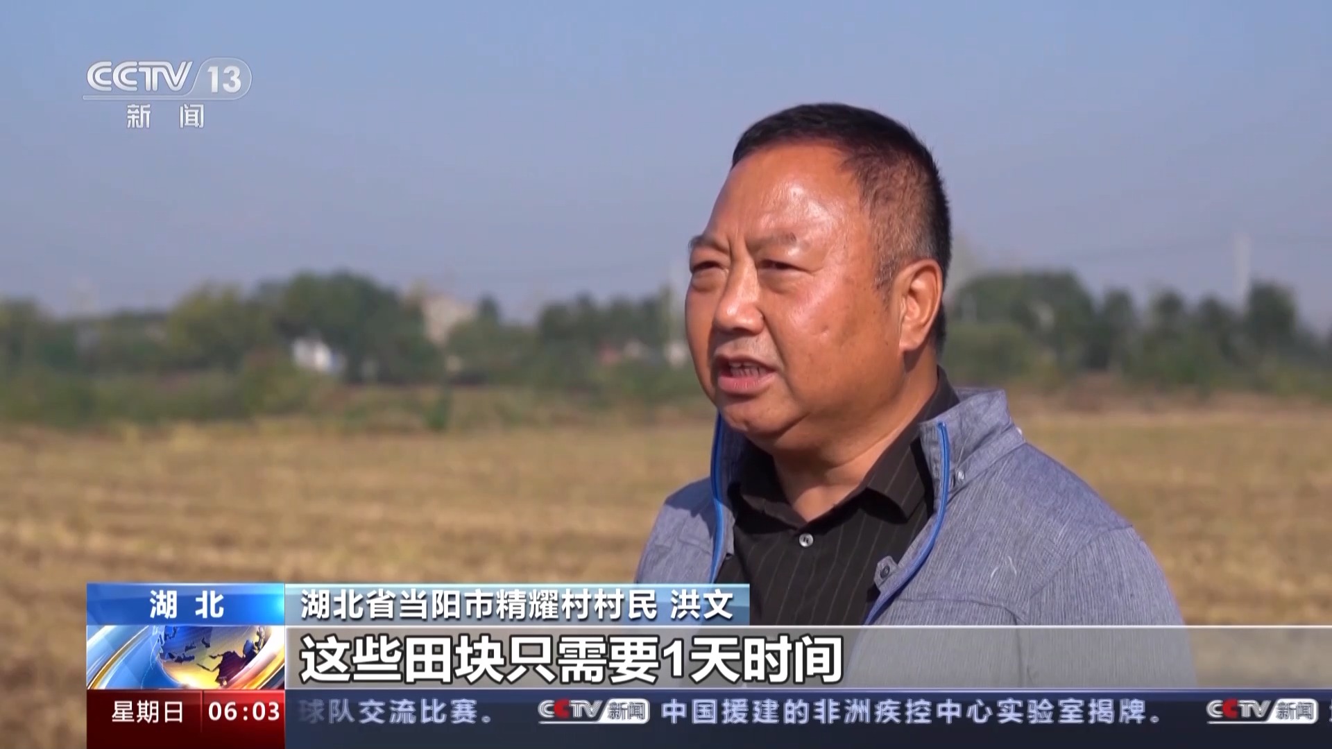 湖北省当阳市精耀村村民 洪文:以前二十几亩田种小麦的话,田块又比较多,比较零散,最快要3到4天,通过调整以后,就调到我自己家门口,这些田块只需要1天时间,就可以把它种完。