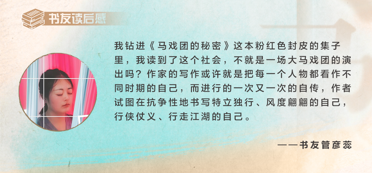 篇幅所限,长话短说。如果仅从主角的角度上定位为作家自传,那似乎是很对不起“马戏团”里的“秘密”的,更是对不起作者梁帅先生的。我的感觉是,所有上了场的人物,无论小老爷子、王二锁、李小雨、邱龙江、安凯、尹薇,还是李三、王四、薛五、赵六、金九;无论是李维达、洋洋、骑恐龙的男孩,还是荀老师、王老师;无论是王老虎、崔春联、王明才,还是五子、林清、王小花;无论是魏公子、蓝女士、周百万、五奶奶,还是老丁、王姐、小翠、老处长……哪一个人物不是作者本人的视角呢?我们看一场马戏表演,视线是一定不会只跟着那个所谓的主角转的,或许我们会对某一个跑龙套的印象更深刻。