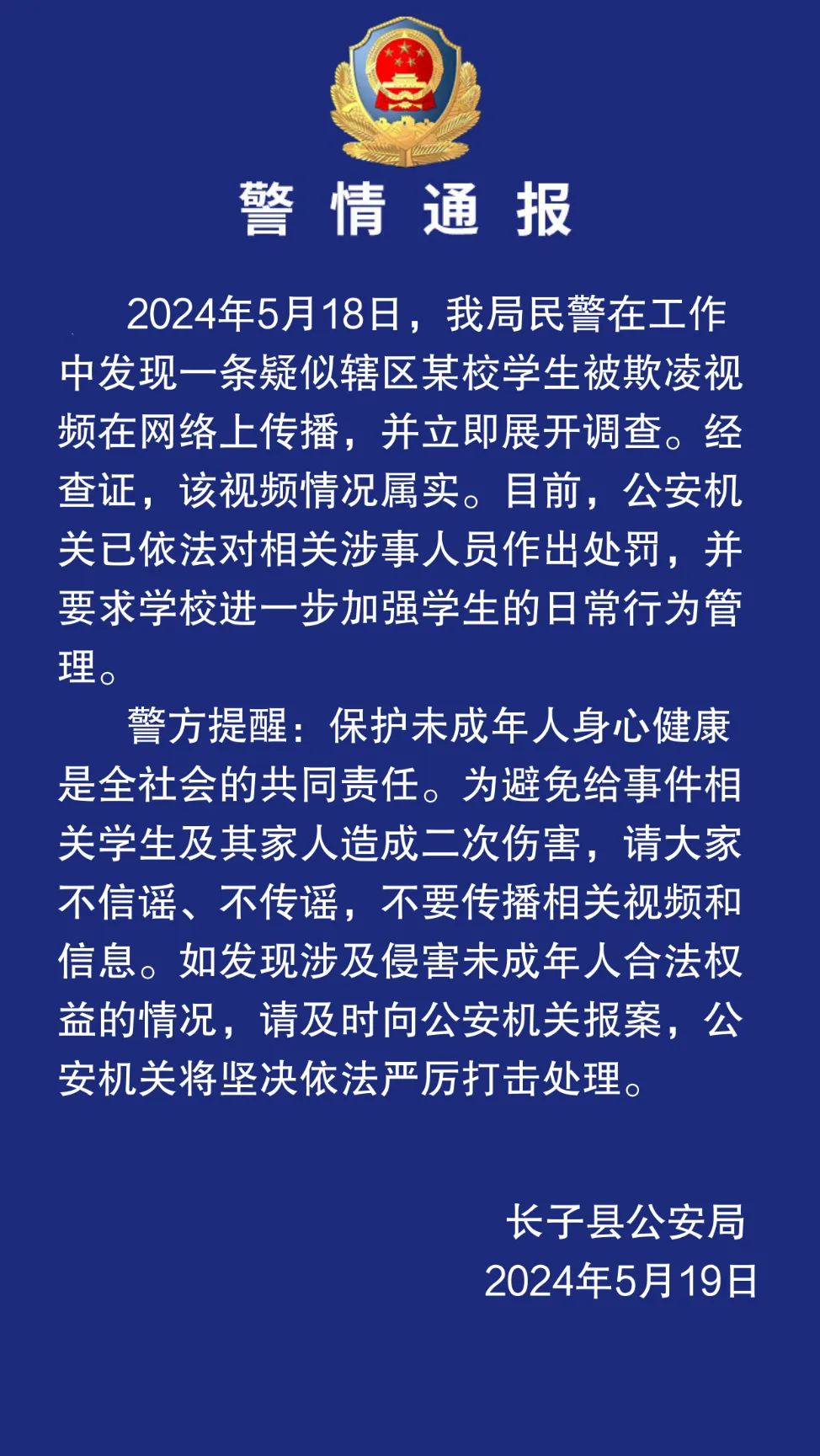 2024年5月18日,长子县公安局民警在工作中发现一条疑似辖区某校学生被欺凌视频在网络上传播,并立即展开调查。经查证,该视频情况属实。目前,公安机关已依法对相关涉事人员作出处罚,并要求学校进一步加强学生的日常行为管理。