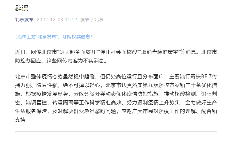 近日,网传北京市“明天起全面放开”“停止社会面核酸”“取消查验健康宝”等消息。北京市防控办回应:这些网传内容为不实消息。北京市整体疫情态势虽然稳中趋缓,但仍处高位运行且分布面广,主要流行毒株BF.7传播力强、隐匿性强,绝不可掉以轻心。北京市认真落实第九版防控方案和二十条优化措施,根据疫情发展形势,分区分级分类动态优化疫情防控措施,推动核酸检测、追阳判密、流调管控、转运隔离等工作科学精准高效,努力遏制疫情上升势头,全力做好生产生活服务保障,及时解决群众急难愁盼问题。感谢广大市民对防疫工作的理解、配合和支持。