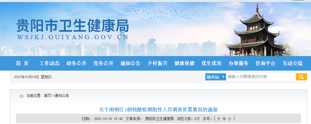 2022年10月16日,南明区发现1名省外返筑人员核酸检测结果异常。接到报告后,党委政府高度重视,第一时间作出部署,果断采取处置措施。目前,流调溯源、核酸筛查、隔离观察、环境消杀等应急处置工作正有序开展。