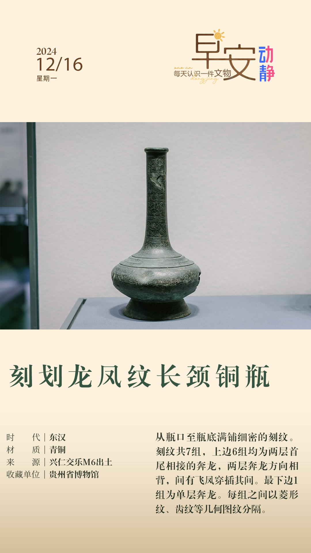 兴仁交乐出土的刻划龙凤纹长颈铜瓶曲线优美、线条流畅,这种造型在西汉中期以后开始出现,并贯穿整个东汉并延续到三国时期,体现了当时的审美观念和艺术风格,既具有实用性,又富有装饰性,是实用与艺术相结合的典范之作。