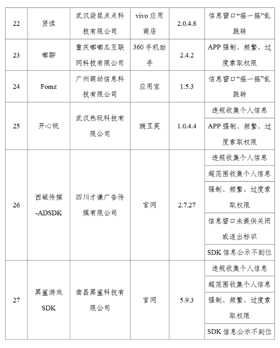 工业和信息化部高度重视用户权益保护工作,依据《个人信息保护法》《网络安全法》《电信条例》《电信和互联网用户个人信息保护规定》等法律法规,持续整治APP侵害用户权益的违规行为。近期,工信部组织第三方检测机构进行抽查,共发现27款APP及SDK存在侵害用户权益行为(详见附件),现予以通报。